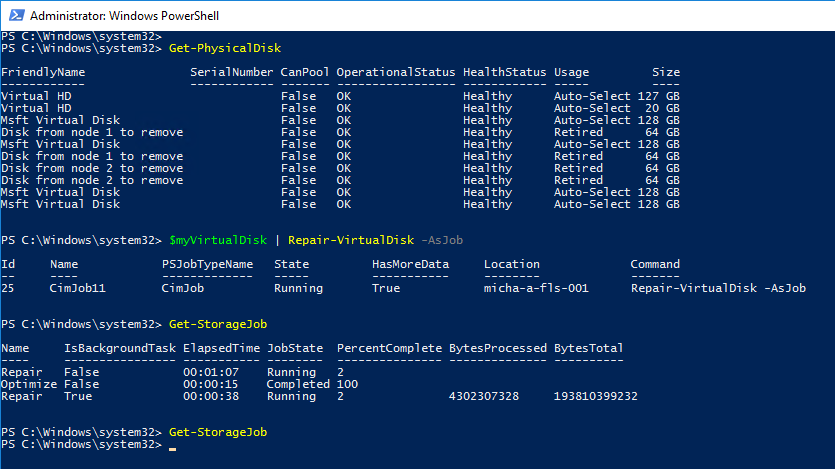 $myVirtualDisk | Repair-VirtualDisk -AsJob